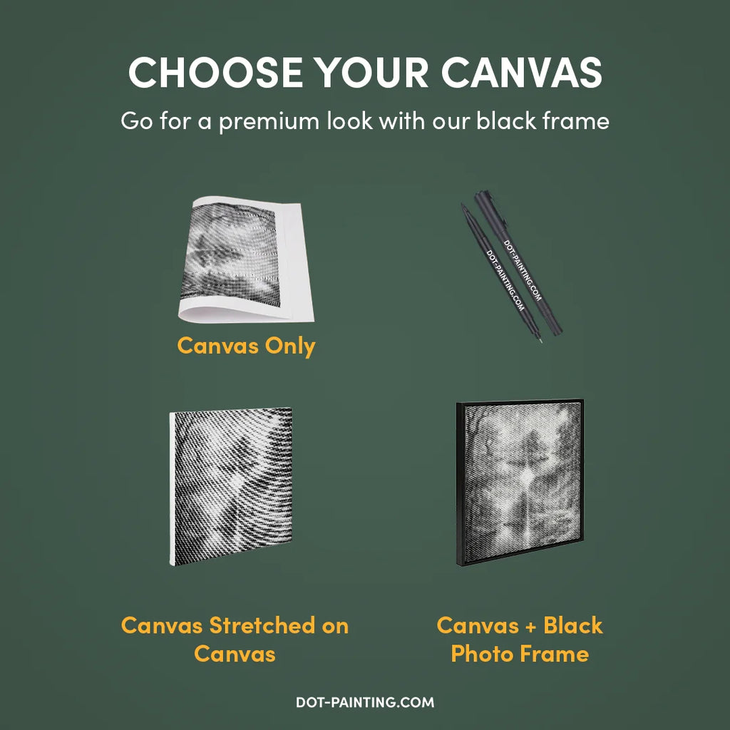 • 1x Lienzo premium (enrollado): Lienzo de alta calidad con el diseño que elegiste. Lo enviamos enrollado en un tubo rígido nunca doblado para que empieces con una superficie lisa y sin arrugas.