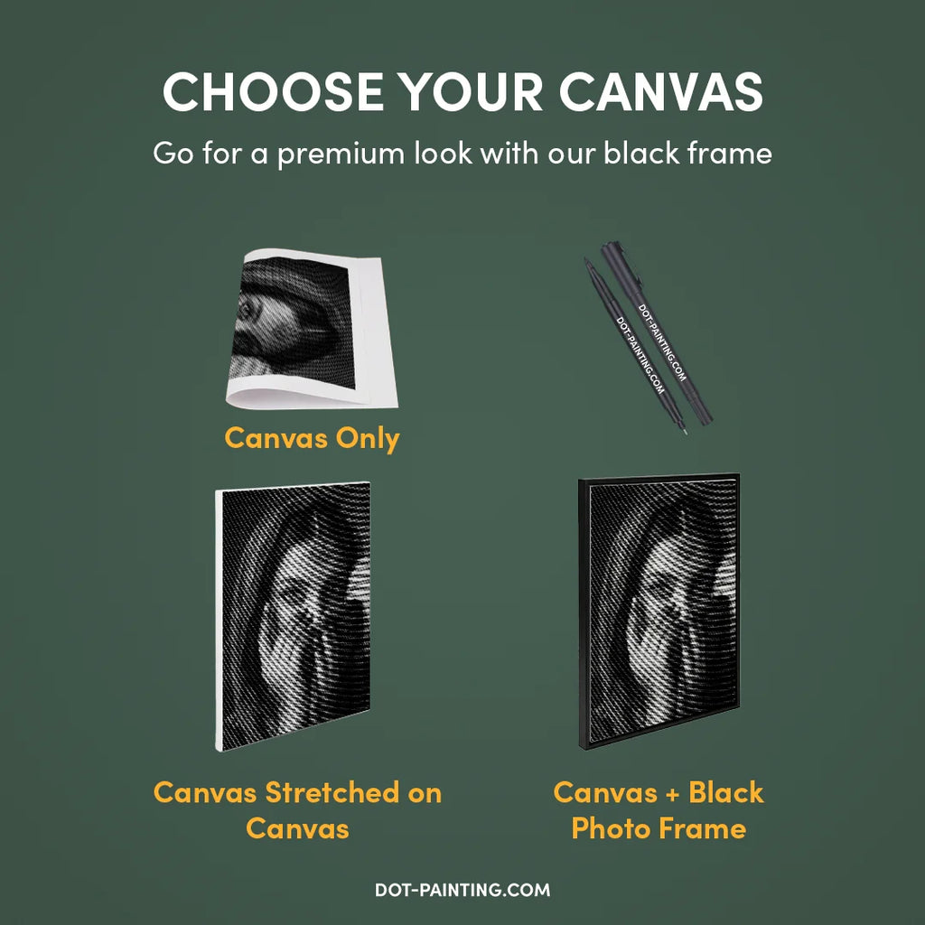 • 1x Lienzo premium (enrollado): Lienzo de alta calidad con el diseño que elegiste. Lo enviamos enrollado en un tubo rígido nunca doblado para que empieces con una superficie lisa y sin arrugas.