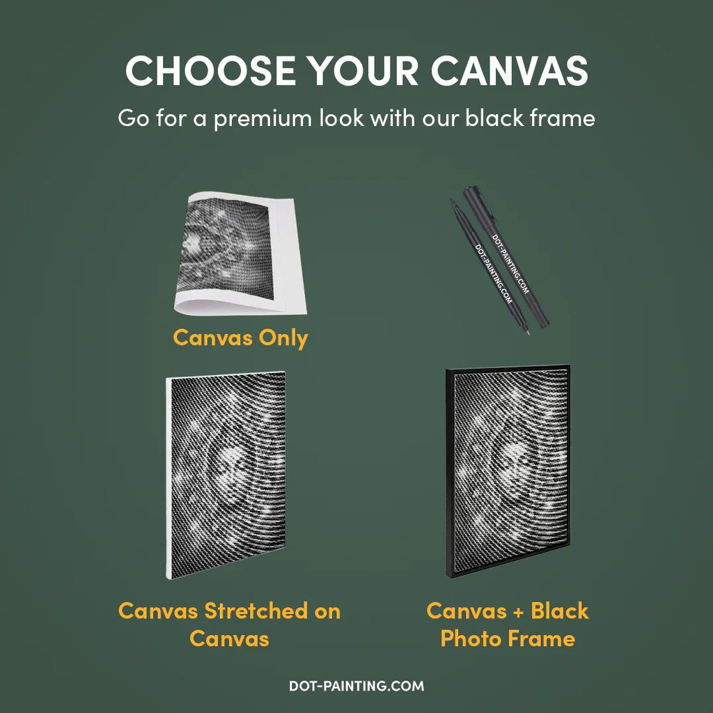 • 1x Lienzo premium (enrollado): Lienzo de alta calidad con el diseño que elegiste. Lo enviamos enrollado en un tubo rígido nunca doblado para que empieces con una superficie lisa y sin arrugas.