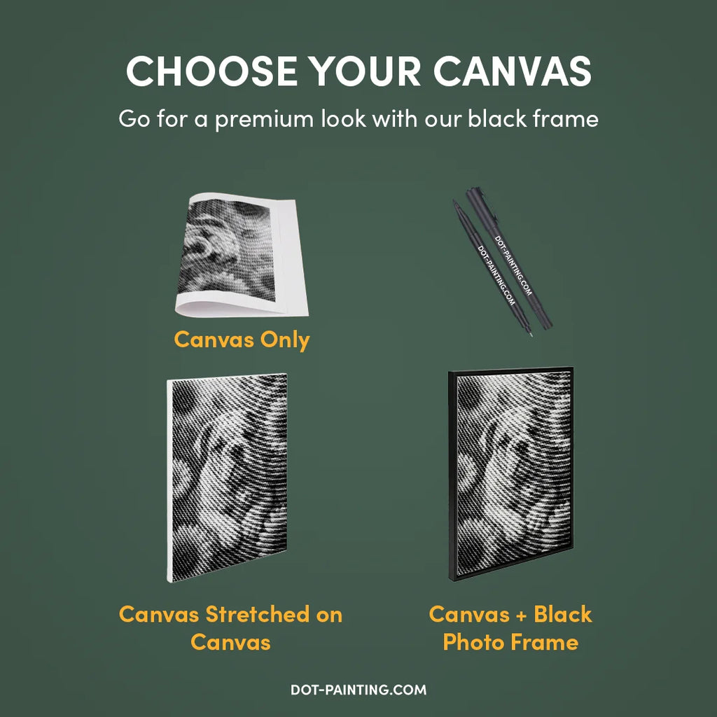 • 1x Lienzo premium (enrollado): Lienzo de alta calidad con el diseño que elegiste. Lo enviamos enrollado en un tubo rígido nunca doblado para que empieces con una superficie lisa y sin arrugas.