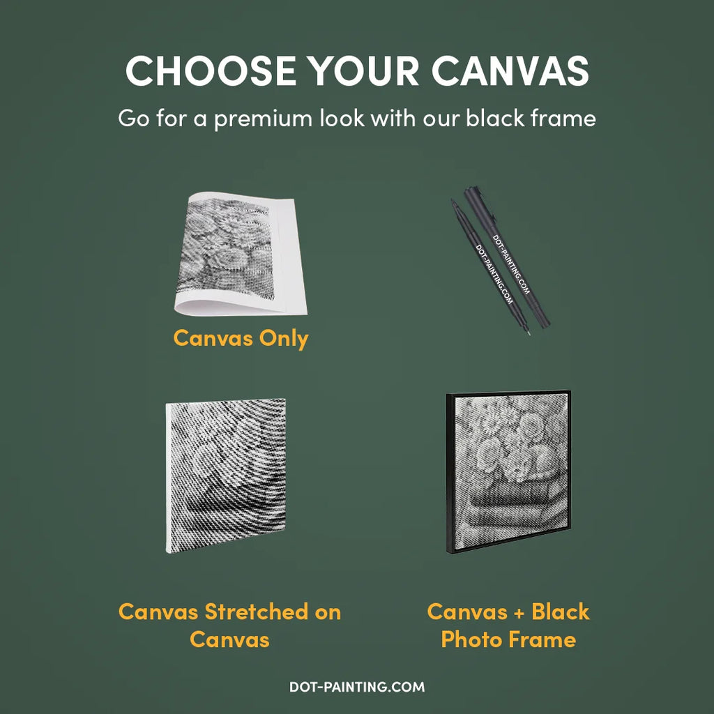• 1x Lienzo premium (enrollado): Lienzo de alta calidad con el diseño que elegiste. Lo enviamos enrollado en un tubo rígido nunca doblado para que empieces con una superficie lisa y sin arrugas.