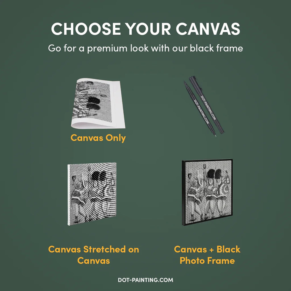 • 1x Lienzo premium (enrollado): Lienzo de alta calidad con el diseño que elegiste. Lo enviamos enrollado en un tubo rígido nunca doblado para que empieces con una superficie lisa y sin arrugas.