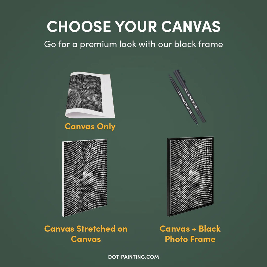 • 1x Lienzo premium (enrollado): Lienzo de alta calidad con el diseño que elegiste. Lo enviamos enrollado en un tubo rígido nunca doblado para que empieces con una superficie lisa y sin arrugas.