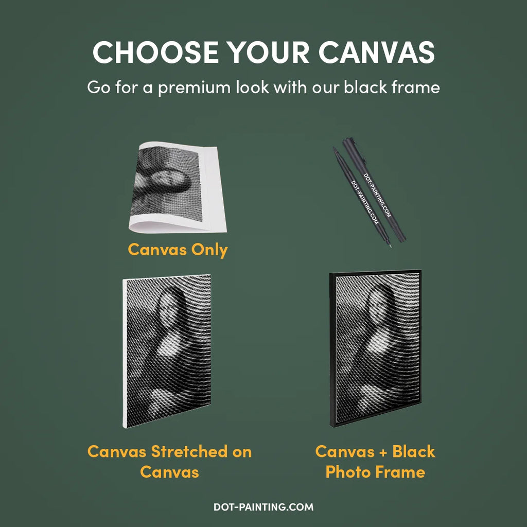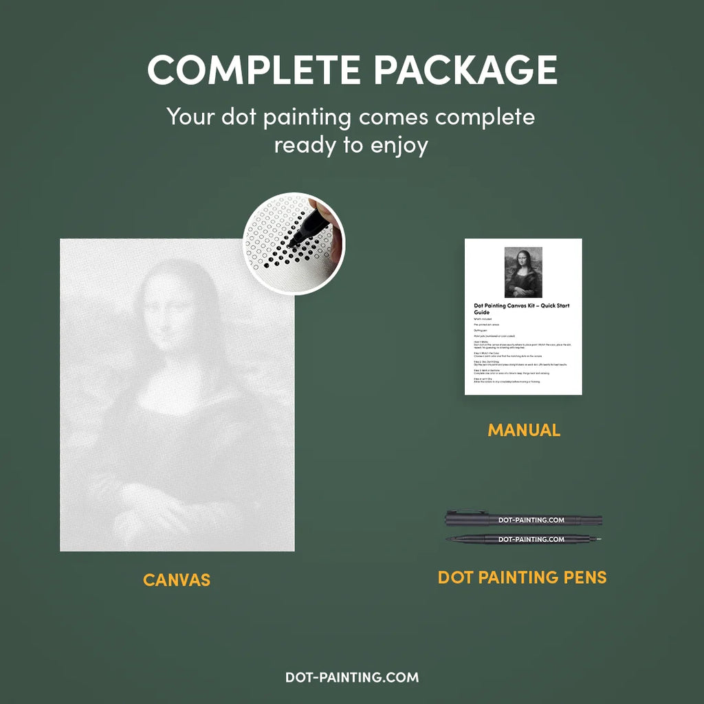 • 1x Lienzo premium (enrollado): Lienzo de alta calidad con el diseño que elegiste. Lo enviamos enrollado en un tubo rígido nunca doblado para que empieces con una superficie lisa y sin arrugas.