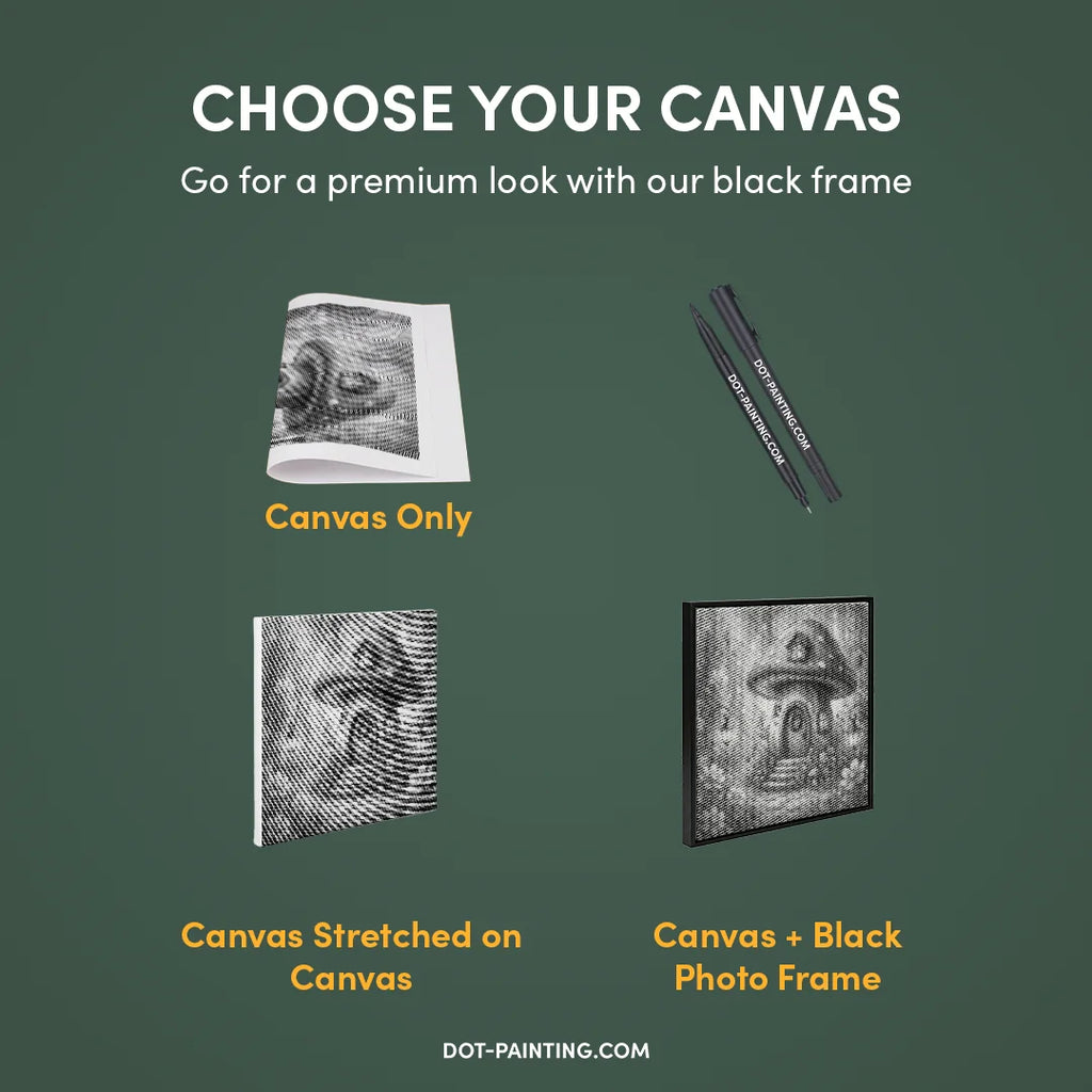 • 1x Lienzo premium (enrollado): Lienzo de alta calidad con el diseño que elegiste. Lo enviamos enrollado en un tubo rígido nunca doblado para que empieces con una superficie lisa y sin arrugas.